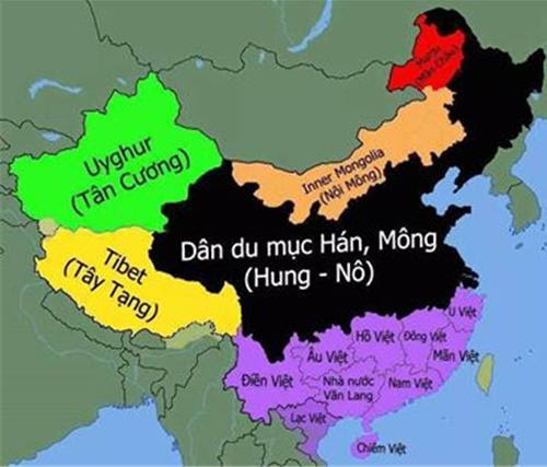 Ở trên mới nói đến vấn đề phát âm mà đã vậy rồi, nói đến văn phạm, ngữ pháp còn độc đáo, khác xa hơn nữa. Cấu trúc cơ bản của tiếng Việt là văn xuôi, nói viết đều xuôi theo sự việc, nghe đọc đến đâu hiểu đến đó, không như những ngôn ngữ khác, phải đợi đến hết câu mới hiểu. Nét đặc thù này chỉ có dân tộc Bách Việt mới có. Các bạn hãy nhìn bản đồ bên dưới sẽ thấy tộc Bách Việt sinh sống trải dài từ phía nam sông Dương tử của TQ xuống phía nam (những ô màu tím). Tiếc thay, qua mấy ngàn năm, nhưng chi tộc Việt kia đã bị dân Tàu (Hán, Mông, Hung nô) tràn xuống và đồng hoá hết ráo, chỉ còn tộc Lạc Việt chúng ta, cho dù bị Tàu đô hộ cả ngàn năm, vẫn giữ được bản sắc, ngôn ngữ cho tới ngày nay.